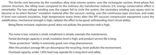 Companies leading products: 10kV, 20kV, 10kV, 35kV oil immersed transformers; 20kV, 35kV vacuum epoxy pouring dry transformer; 10kV, 20kV, 35kV encapsulation (SG) vacuum impregnation and dry type transformer, box type substation, and according to the design and manufacture of various types of special transformer customer requirements. The company has developed the transformer has been through the National Transformer Quality Supervision and Testing Center for routine, type, special test.