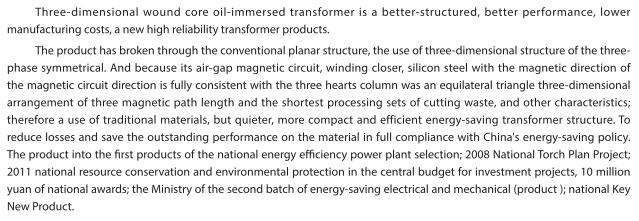 Companies leading products: 10kV, 20kV, 10kV, 35kV oil immersed transformers; 20kV, 35kV vacuum epoxy pouring dry transformer; 10kV, 20kV, 35kV encapsulation (SG) vacuum impregnation and dry type transformer, box type substation, and according to the design and manufacture of various types of special transformer customer requirements. The company has developed the transformer has been through the National Transformer Quality Supervision and Testing Center for routine, type, special test.